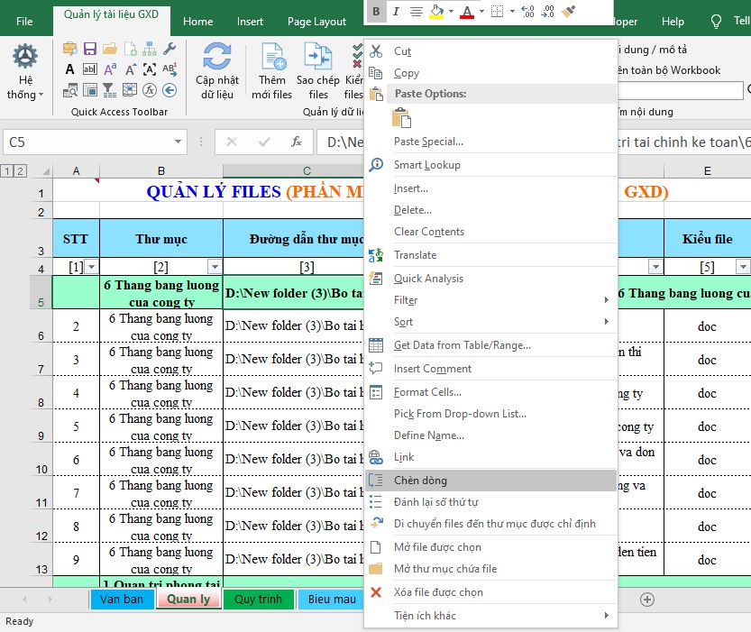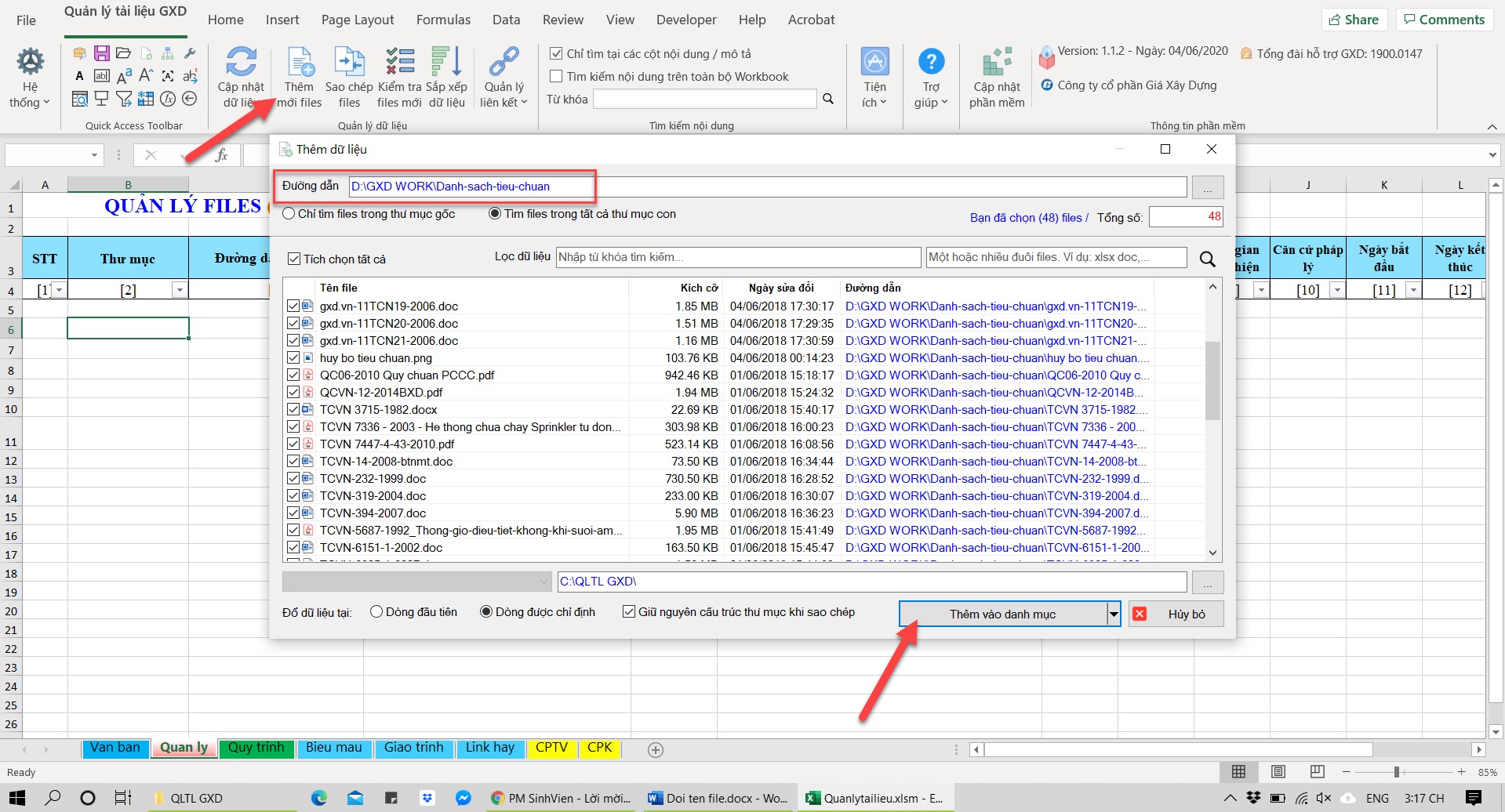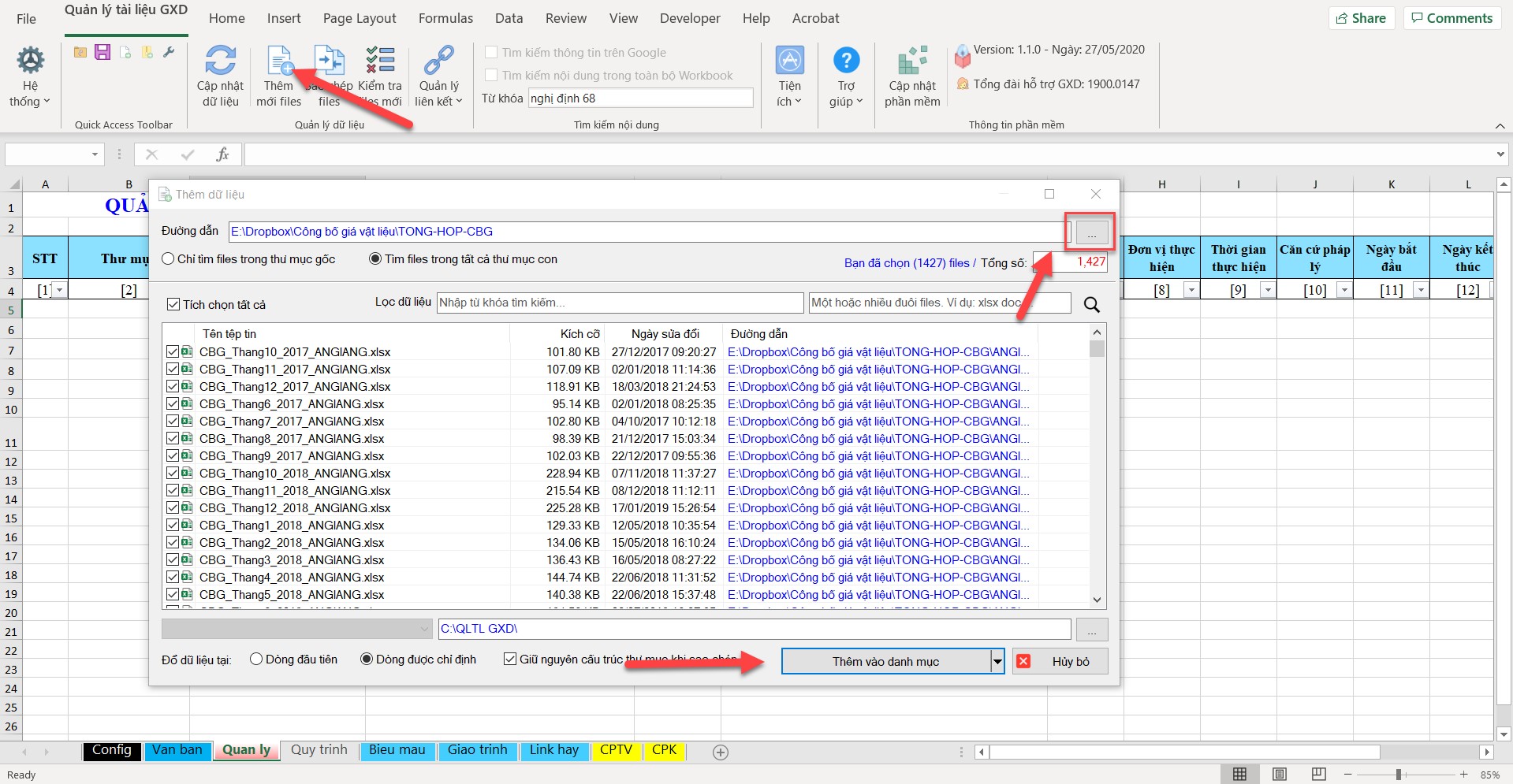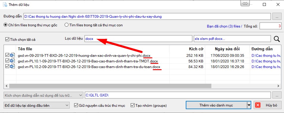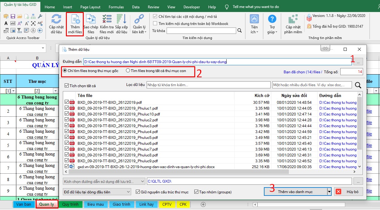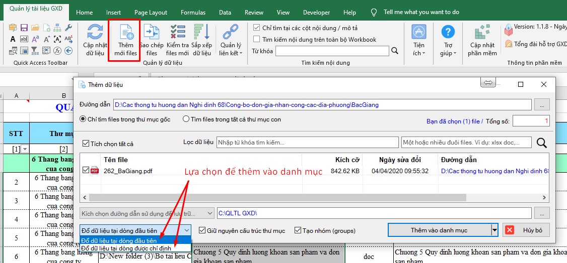 - Mở phần mềm QLTL GXD , tại sheet Quan ly , chọn lệnh Thêm mới files