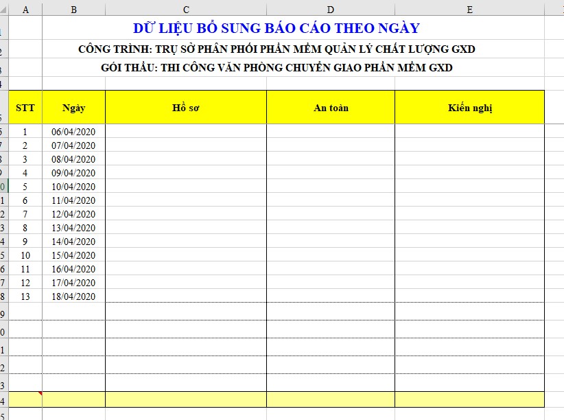 Các công tác về Hồ sơ, An toàn, và Kiến nghị sẽ nhập ở sheet Dữ liệu bổ sung, ý kiến của TVGS về việc này có thể chung với dự án, hoặc ý kiến riêng với từng nhà thầu có thể ghi tổng hợp vào các mục này chứ không vào từng mục riêng của Nhà thầu.