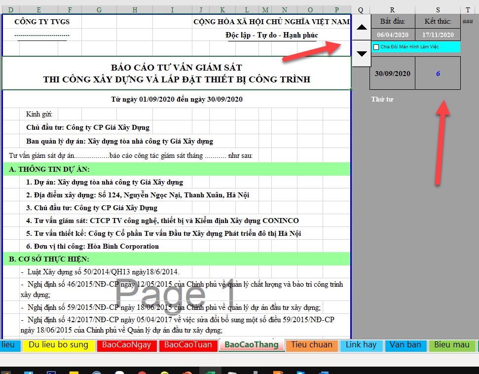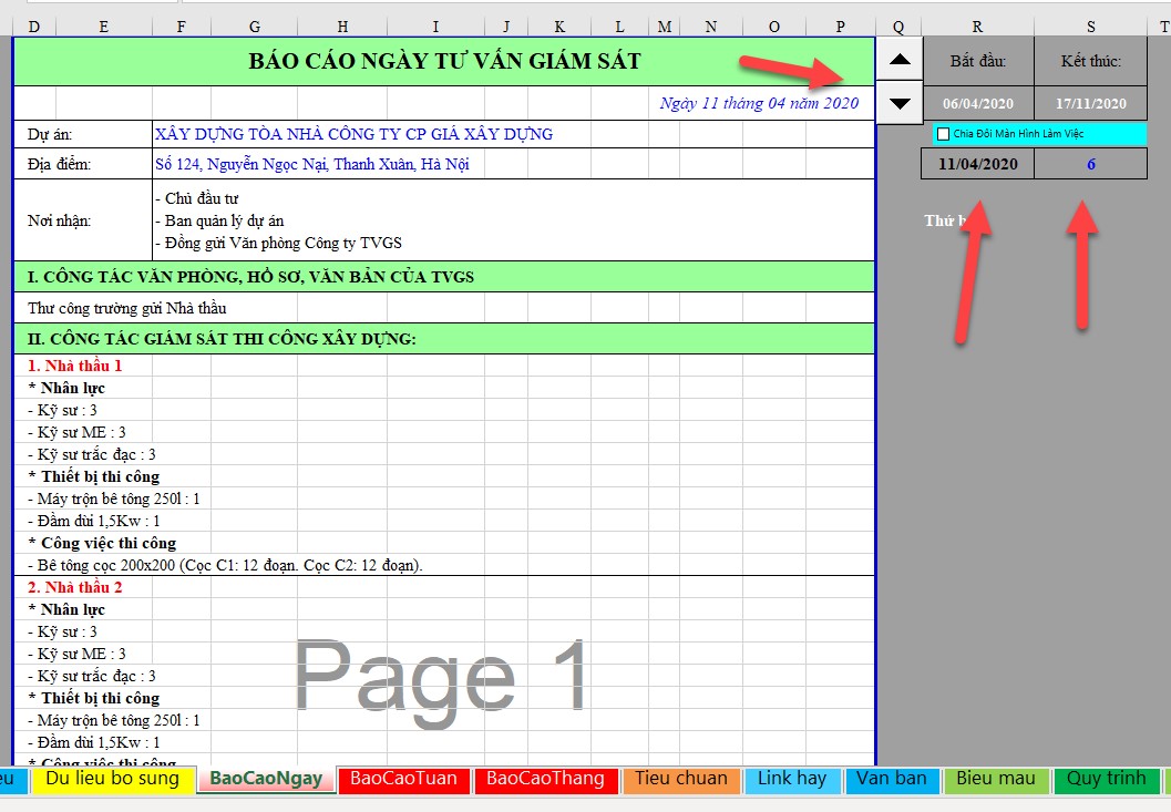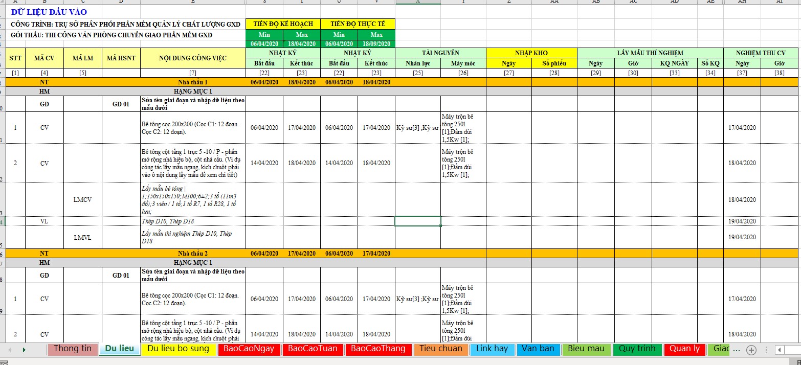 Rồi bắt đầu làm ở Sheet Dữ liệu sẽ là nơi Kỹ sư TVGS cập nhật các công việc thi công của các Nhà thầu, để từ đây, phần mềm sẽ tự động link sang Báo cáo ngày, Báo cáo Tuần, Báo cáo tháng.