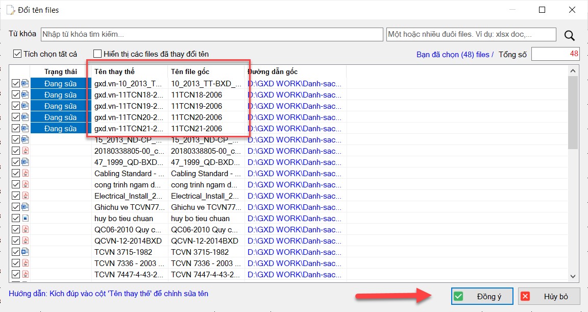 Nếu ở đây, tên mới vẫn chưa đúng hoặc bạn muốn sửa tiếp tên các files khác thì vẫn có thể làm bằng cách "Kích đúp vào cột Tên thay thế để chỉnh sửa tên". Cuối cùng, ấn đồng ý để thực hiện, bạn mở thư mục chứa file đó và kiểm tra lại kết quả của mình.