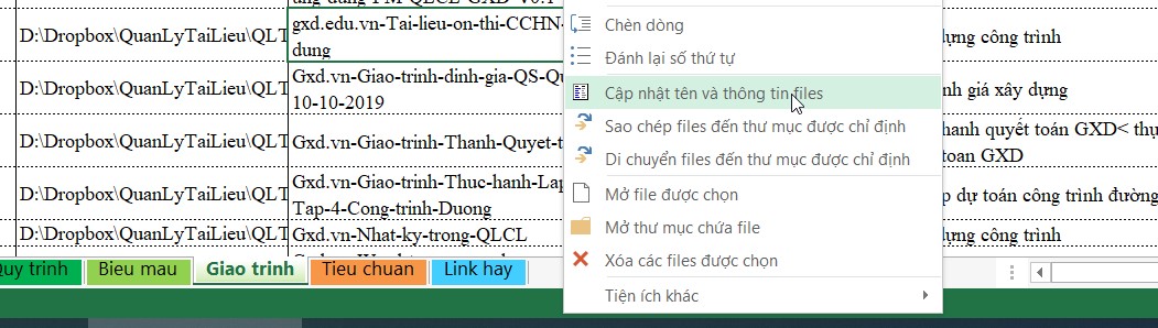 Sau đó kích phải chọn lệnh Cập nhật tên và thông tin files: