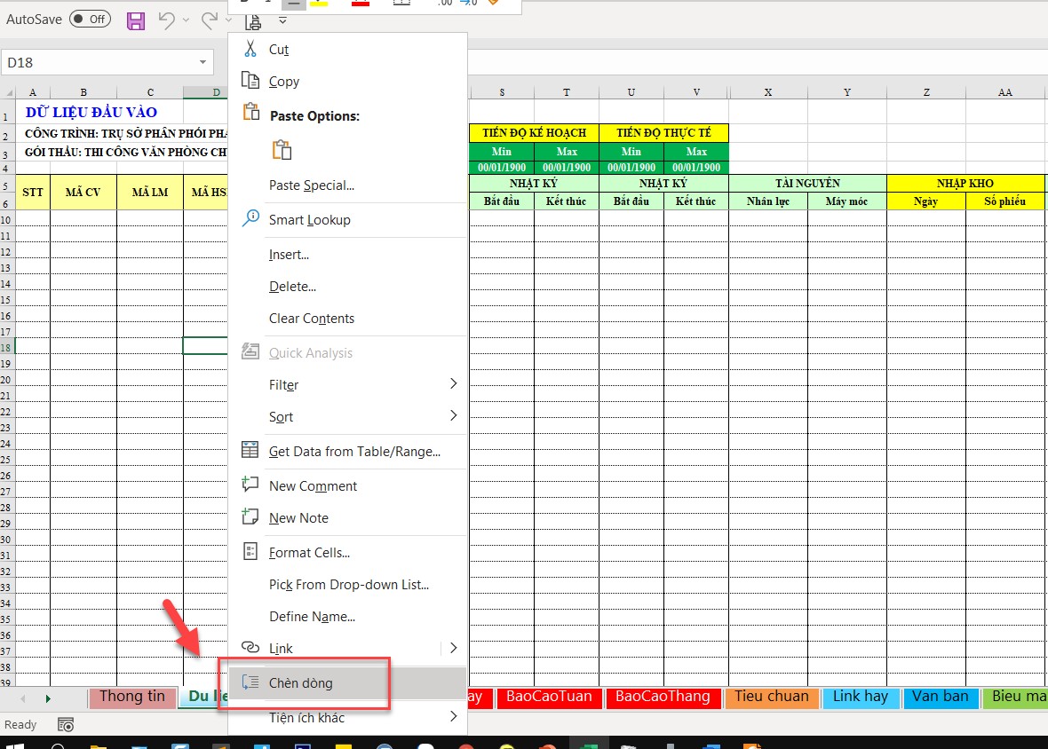 Khi làm bạn xóa các dòng công việc của nhà thầu phần mềm đang để mẫu rồi bạn click chuột phải chọn chèn dòng và điền số dòng cần chèn để chèn thêm dòng rồi nhập dữ liệu theo dự án mình đang làm: