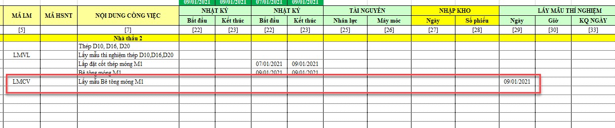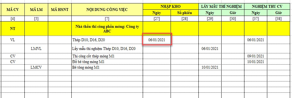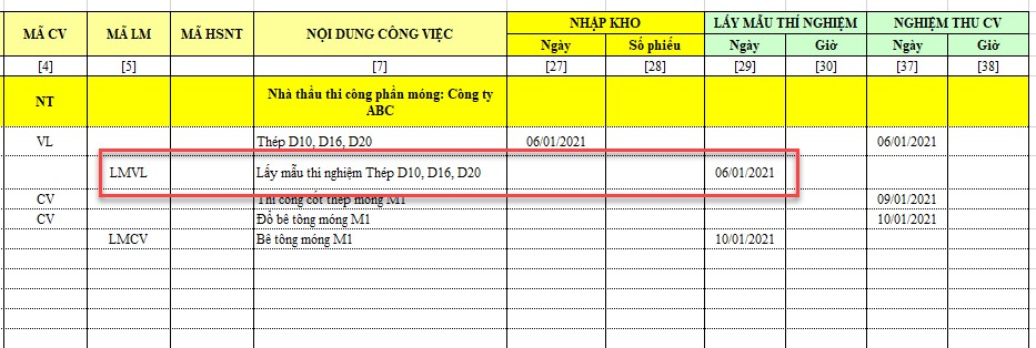 - Để lấy mẫu vật liệu nhập về bạn gõ ký hiệu là LMVL ở cột Mã LM, rồi ghi nội dung lấy mẫu ở cột Nội dung công việc. Và điền ngày lấy mẫu ở cột Lấy mẫu thí nghiệm.