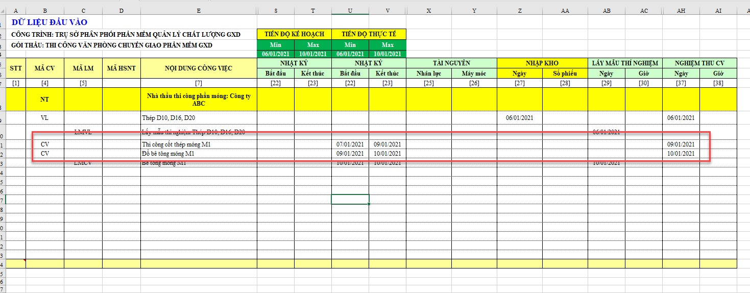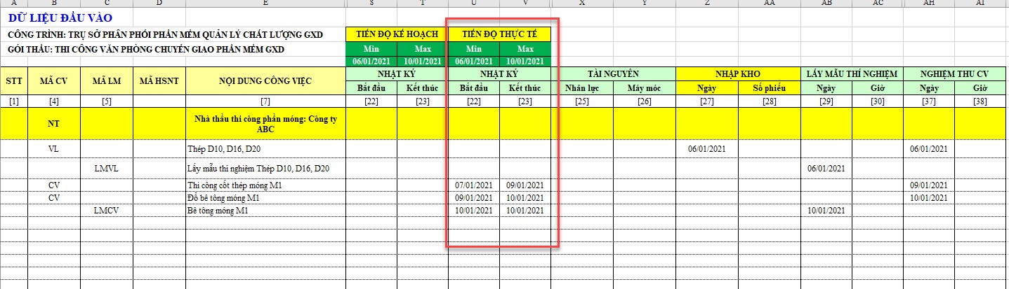 Nếu công việc đó diễn ra trong nhiều ngày thì bạn điền ngày bắt đầu và ngày kết thúc ở cột Tiến độ để Phần mềm đổ dữ liệu các ngày thực hiện việc này ra Báo cáo. Còn nếu chỉ điền ngày nghiệm thu và ngày nhập kho như hướng dẫn ở trên thì phần mềm chỉ đổ ra đúng ngày đó có vật liệu nhập về và nghiệm thu vật liệu đầu vào.