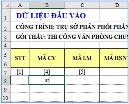 Ở cột MÃ CV, bạn gõ "nt" để ra phần dữ liệu Nhà thầu và nhập các công việc thực hiện của Nhà thầu đó để báo cáo.