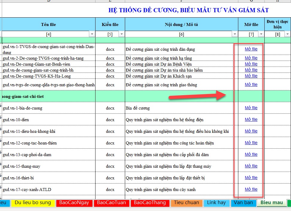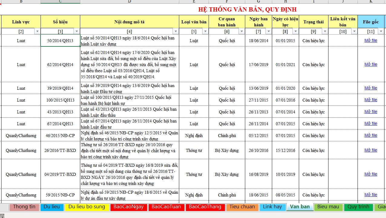 - Bạn chỉ cần click vào nút Mở file bên phải là sẽ mở file ra cho bạn xem các quy định, văn bản của Nhà nước liên quan đến công tác Xây dựng nói chung và Tư vấn giám sát nói riêng (Ở đây, phần mềm đang để các văn bản chính liên quan đến công tác TVGS, còn nhiều văn bản, quy định khác nữa sẽ được cập nhật thêm).