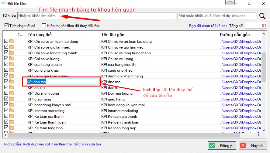 Để di chuyển files đến các thư mục khác, bạn chỉ cần sao chép đường dẫn sẽ chuyển file tới và dán đè lên thay thế đường dẫn files cần chuyển tại cột ''Đường dẫn thư mục''.