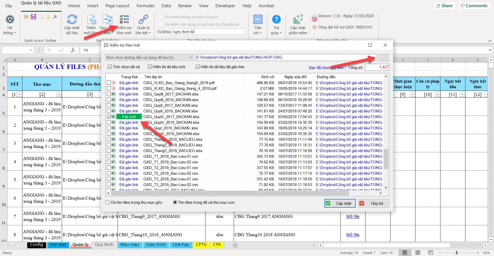 Bạn thêm file mới vào 1 thư mục, bạn muốn cập nhật file đó vào sheet quản lý tài liệu của bạn. Chỉ việc sử dụng Kiểm tra file mới, chọn thư mục, phần mềm sẽ tự động phát hiện ra file mới, chỉ thị cho bạn xác nhận để đưa vào sheet.