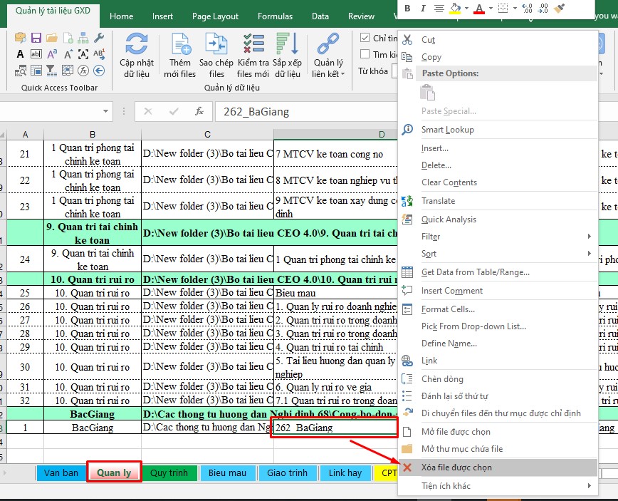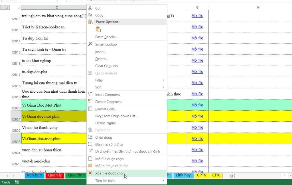 Khi sử dụng lệnh này sẽ xóa dòng thông tin file trong sheet Quản lý và xóa luôn file trong ổ cứng. Hộp thoại nhắc nhở sẽ hiện ra, bạn hãy chắc chắn là muốn xóa hẳn file trong thư mục gốc thì bấm Yes.