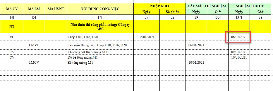 Ngày nghiệm thu vật liệu này sẽ điền bên cột Nghiệm thu công việc