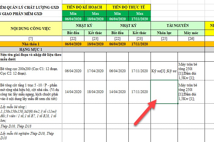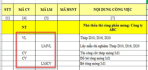 - Công việc thi công mà cần lấy mẫu, ví dụ như lấy mẫu bê tông trong quá trình đổ bê tông thì bạn gõ ký hiệu LMCV ở cột Mã LM và ghi nội dung lấy mẫu ở cột Nội dung công việc.