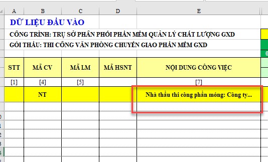 - Các công việc thi công, bạn gõ ký hiệu CV ở cột Mã CV và ghi nội dung ở cột Nội dung công việc.