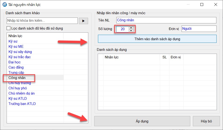 Bạn chọn nhân lực rồi sửa lại số lượng, ấn Thêm vào danh sách áp dụng, rồi ấn áp dụng.