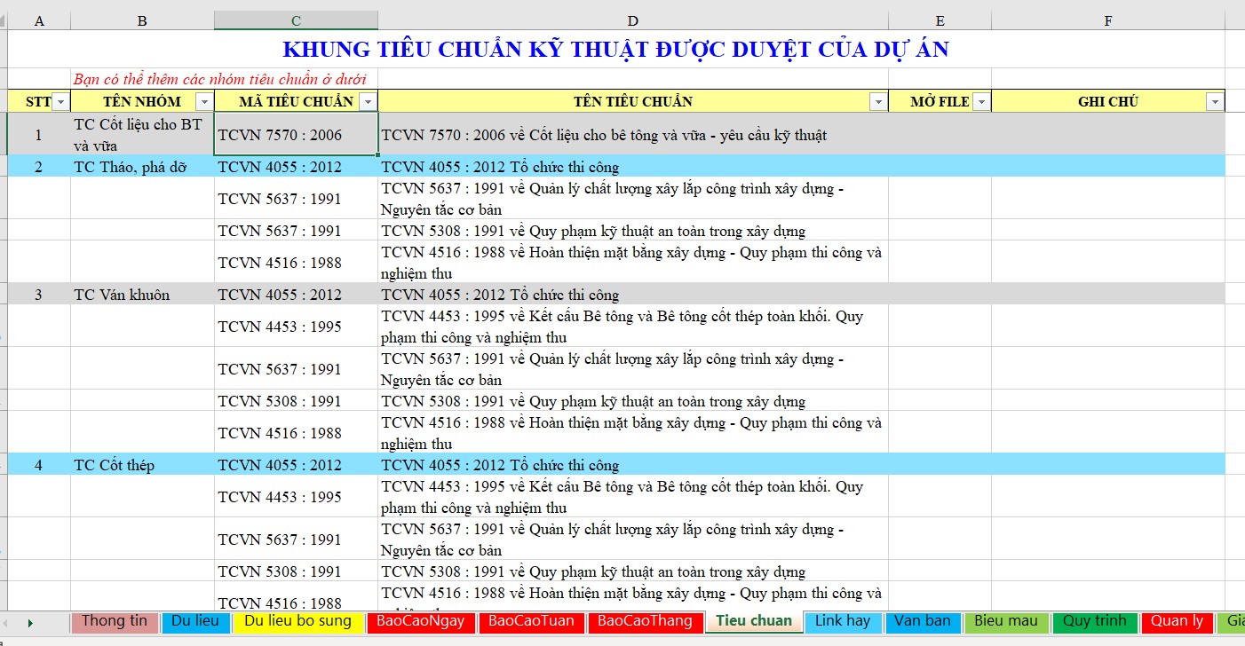 Ở sheet Tiêu chuẩn, đã tích hợp sẵn các Tiêu chuẩn Việt Nam hiện hành