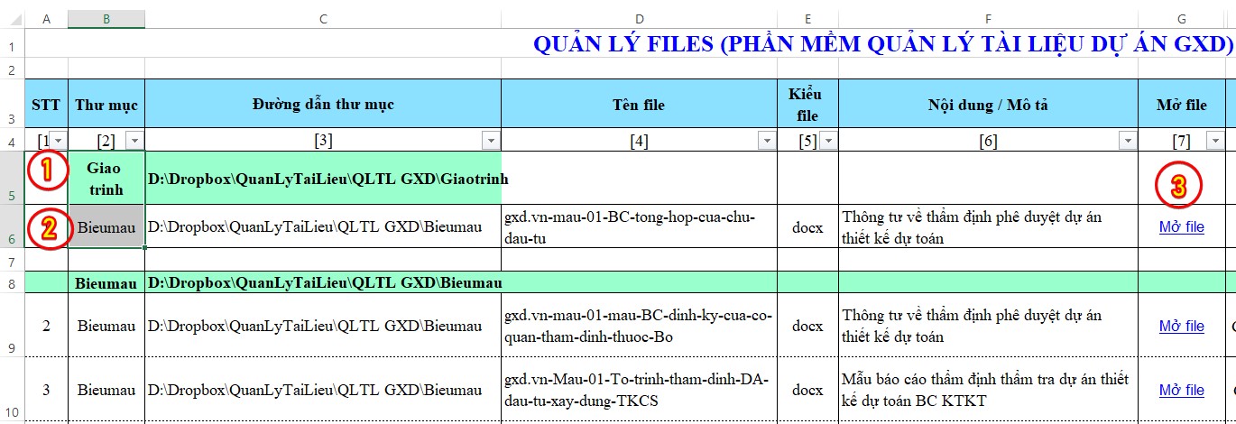 Ví dụ: Hình dưới đây cắt file gxd.vn-mau-01-BC-tong-hop-cua-chu-dau-tu.docx từ thư mục Bieumau sang Giaotrinh. Phần mềm sẽ so sánh dữ liệu ở 3 vị trí 1, 2, 3 để tự động thay đổi cho khớp nhau.