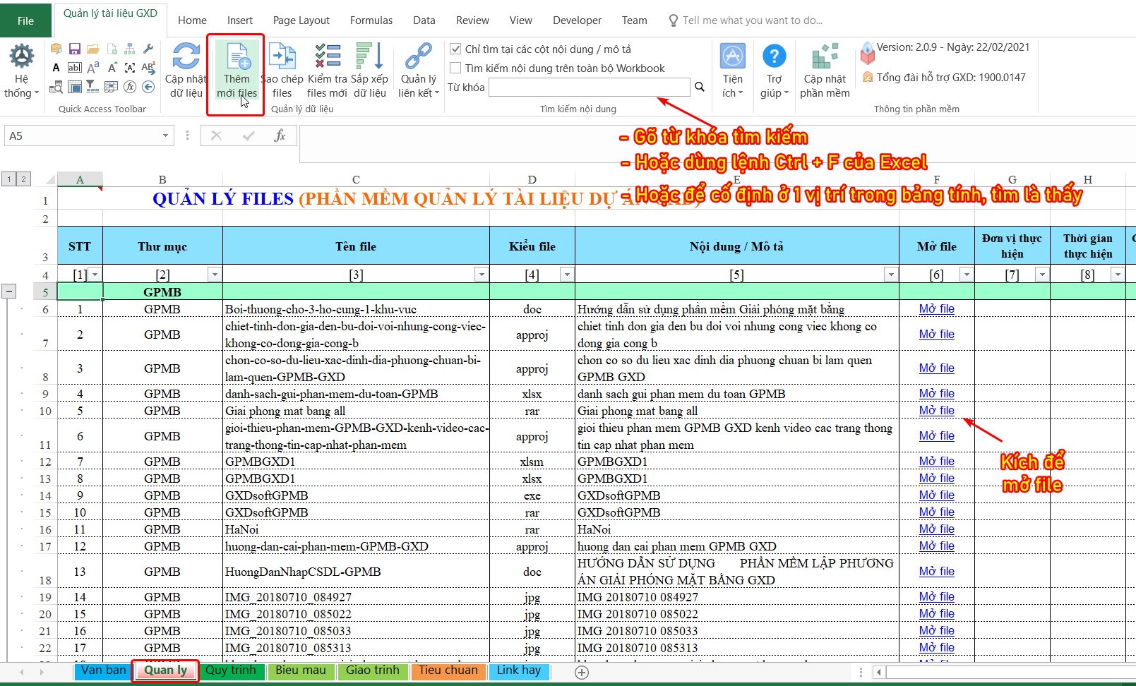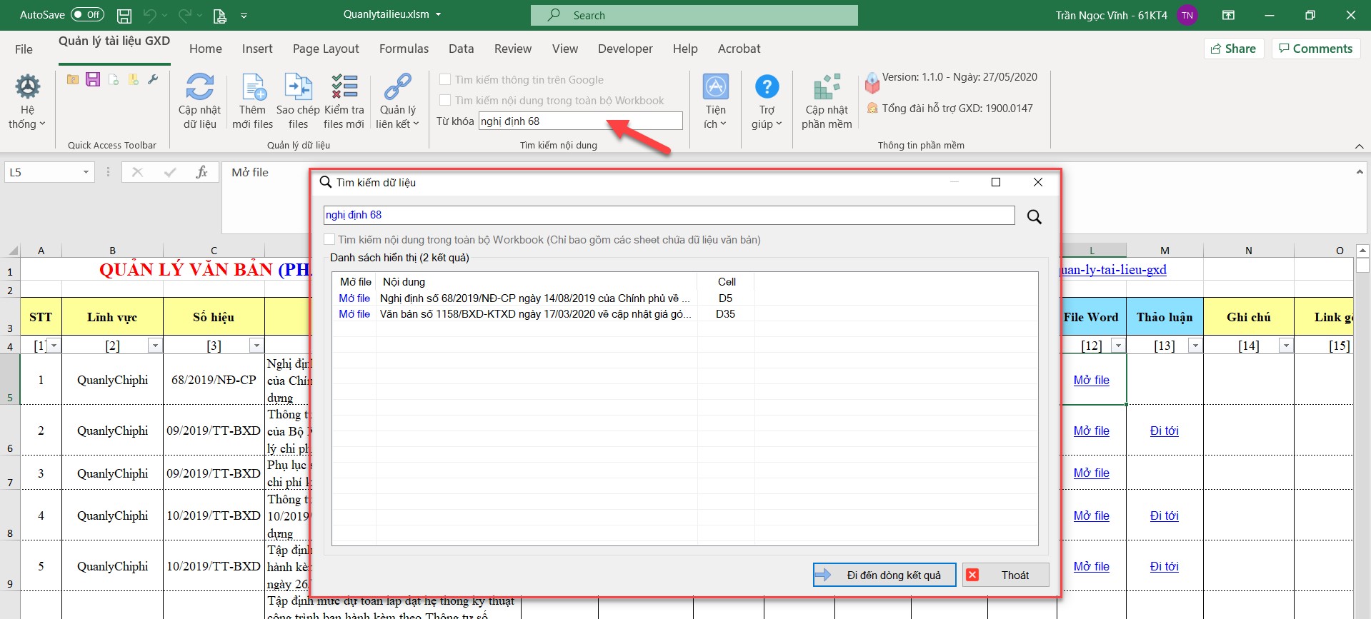 Bất kỳ khi nào cần tìm tài liệu gì của dự án, bạn lại ra Desktop, mở file Quanlytailieu.xlsm.
