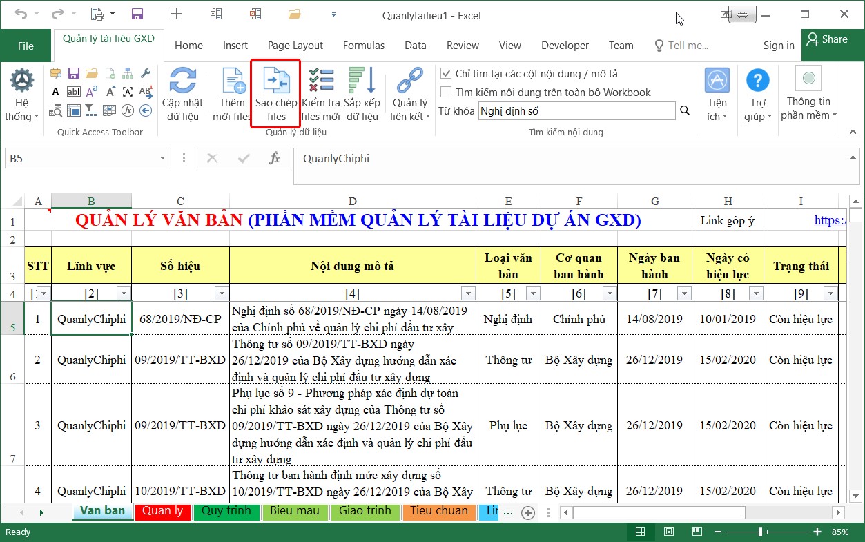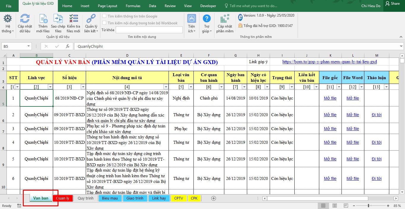 Các văn bản pháp luật về đầu tư xây dựng trình bày ở sheet Van ban. Sheet này để tìm kiếm, quản lý, tra cứu văn bản theo lĩnh vực, chuyên môn với các tài liệu đã được lưu trữ trong phần mềm **hoặc bạn có thể tự đưa thêm vào để có thể quản lý tổng thể. Bởi có nhiều văn bản Tờ trình, Quyết định, Báo cáo… chỉ có ở dự án của bạn cần quản lý.