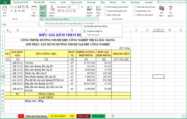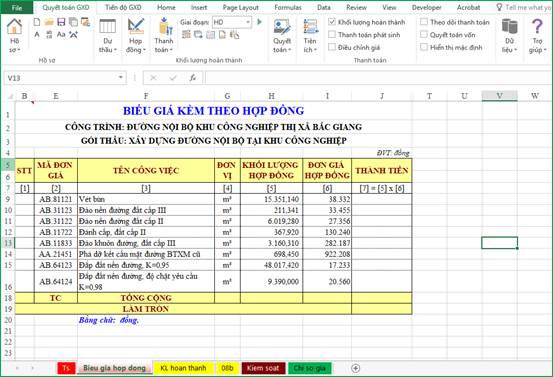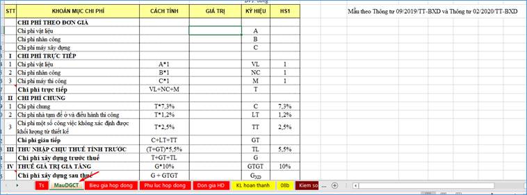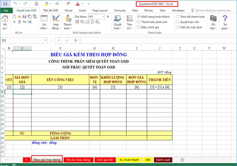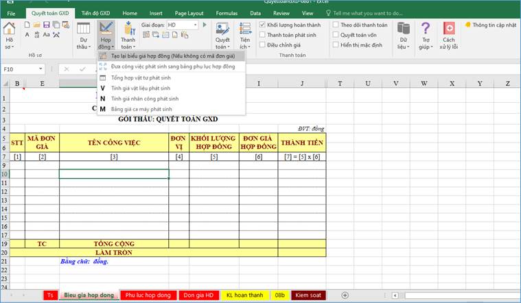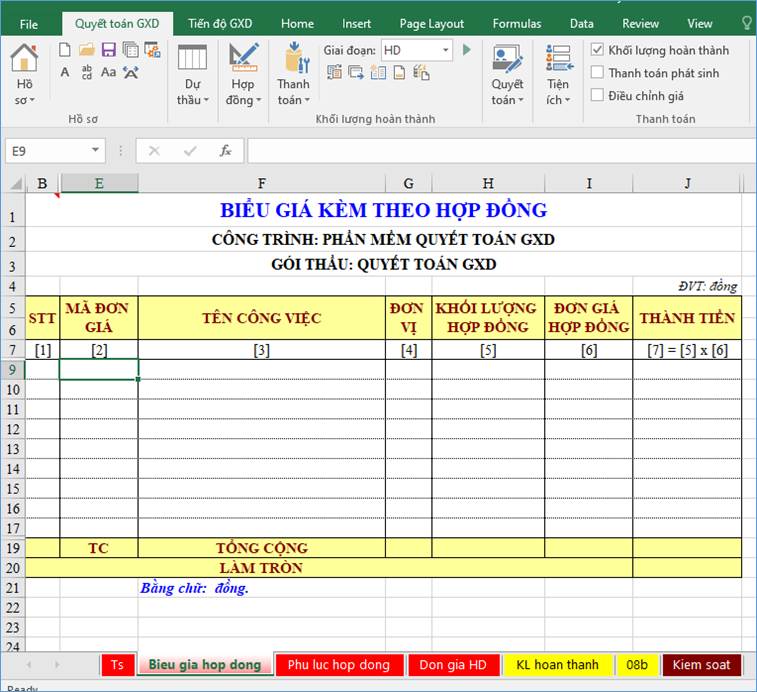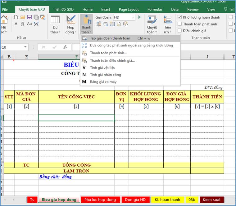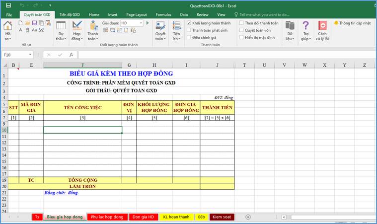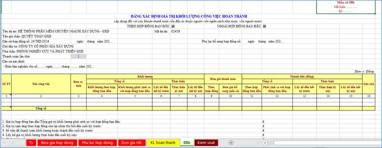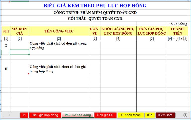 Tương tự như Word, Excel, AutoCad, Revit... khi dùng lệnh này, phần mềm Quyết toán GXD sẽ tạo cho bạn một file mới, có điều file này không trắng tinh như Word, Excel hay AutoCad mà đã kẻ sẵn các bảng biểu theo mẫu (template). File mẫu đó đã nạp luôn vào Excel như hình sau: