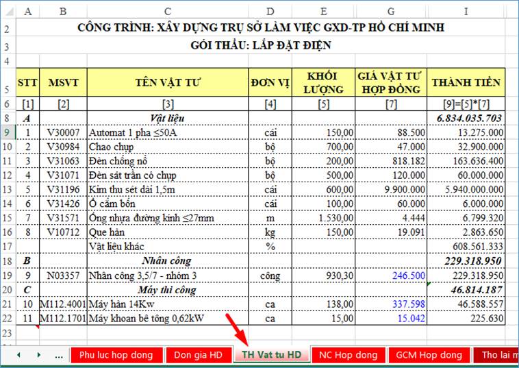 Hợp đồng mua bán vật tư (nếu cần); Các báo giá thời điểm thi công (nếu cần).