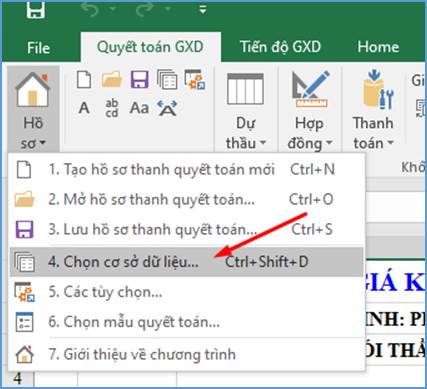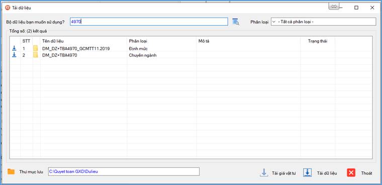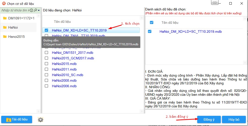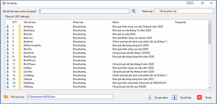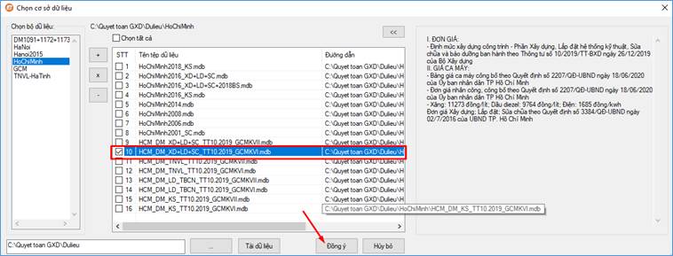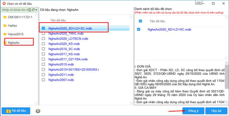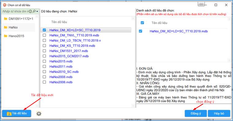 | 4 | Chọn cơ sở dữ liệu | Chọn bộ dữ liệu để sử dụng tương ứng với công trình, hạng mục, gói thầu. |