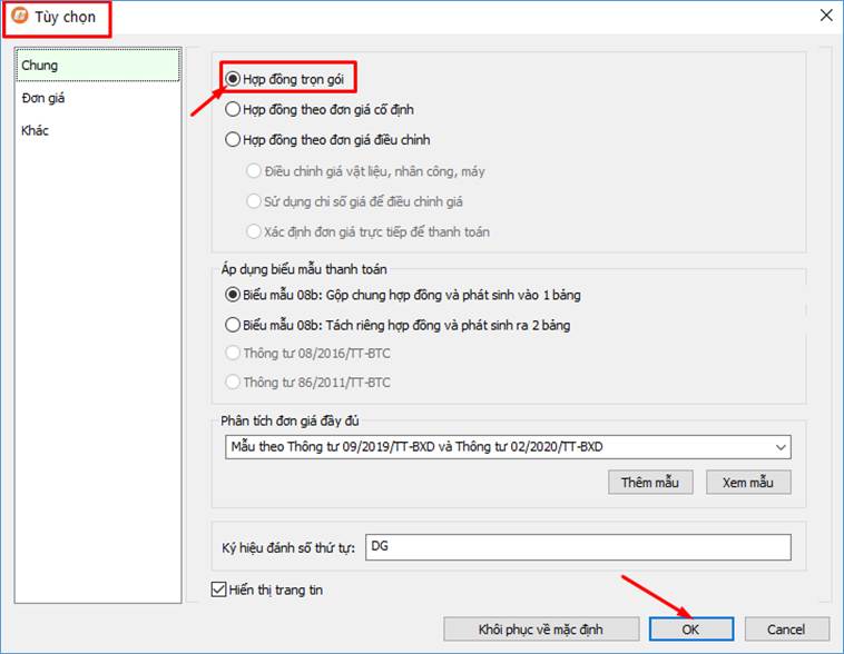 Đối với hợp đồng trọn gói và hợp đồng theo đơn giá có định thì chỉ có 1 tùy chọn duy nhất.