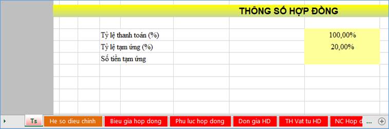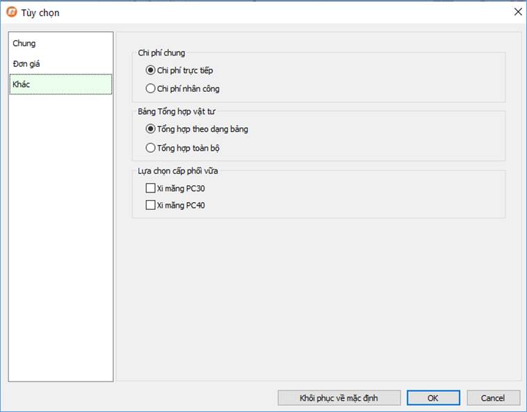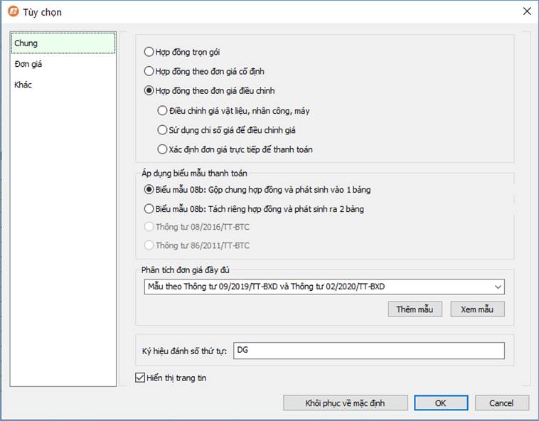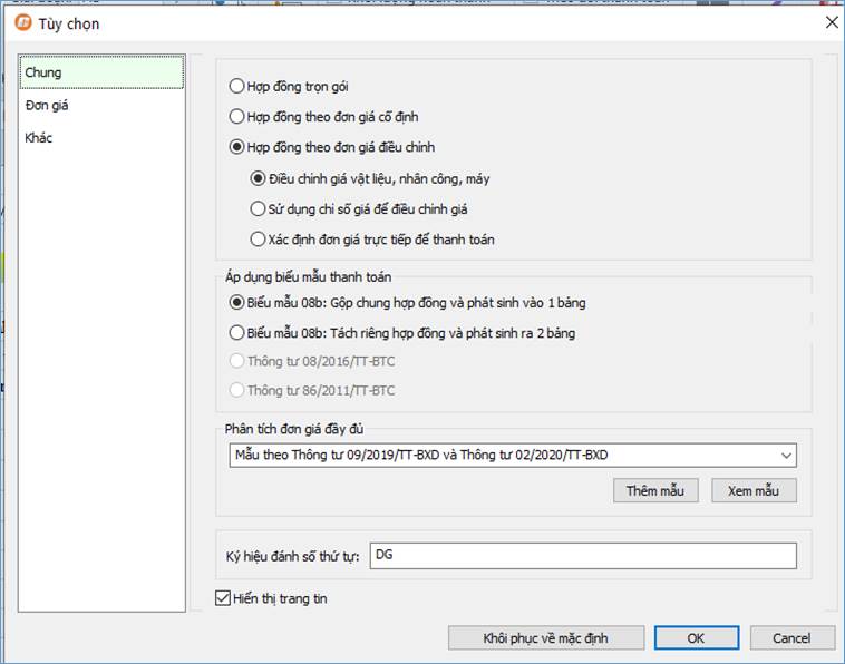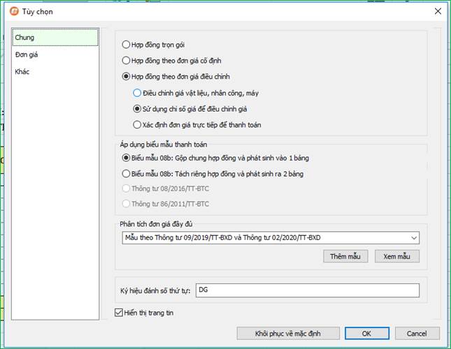 | 5 | Các tùy chọn | Các thiết lập ban đầu đề lập hồ thanh toán như: Chi phí chung, vữa sử dụng, nhóm nhân công, đơn giá trong hợp đồng. |