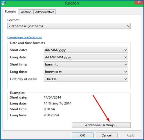 Trong hộp thoại Region hiện ra ta kích vào Addional settings…