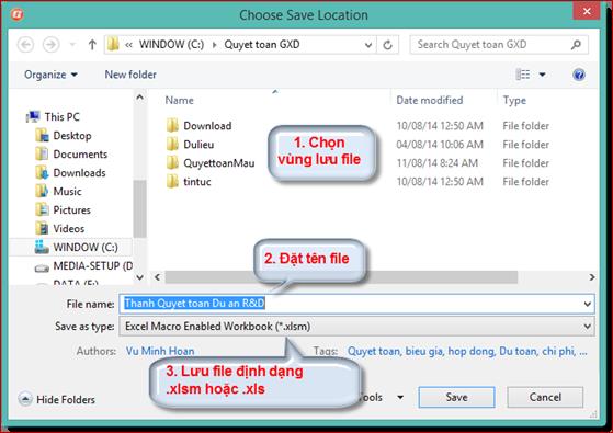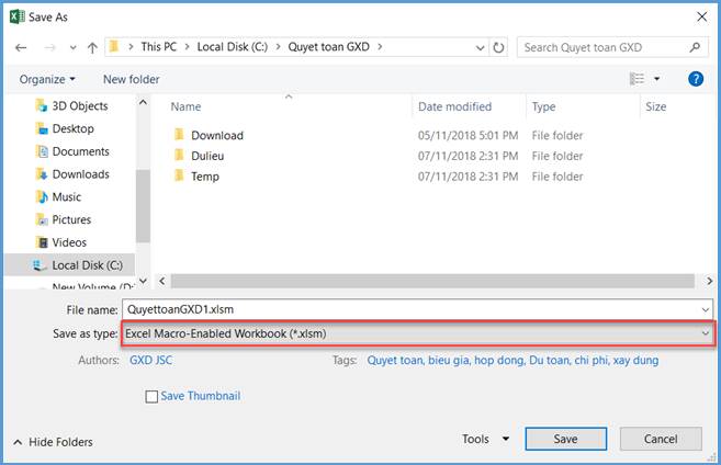 Công việc lập và quản lý hồ sơ thanh quyết toán bạn thường phải thực hiện nhiều lần, đóng/mở file, chỉnh sửa và làm tiếp. Nên việc lưu file Quyết toán GXD dạng .xlsm chạy trên Excel 2010, 2013 hoặc 2016 là rất quan trọng.