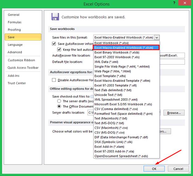 Mở phần mềm Excel. Thực hiện lệnh: File/ Options/ Save/ Excel Macro/ Enabled Workbook (*xlsm) / OK.