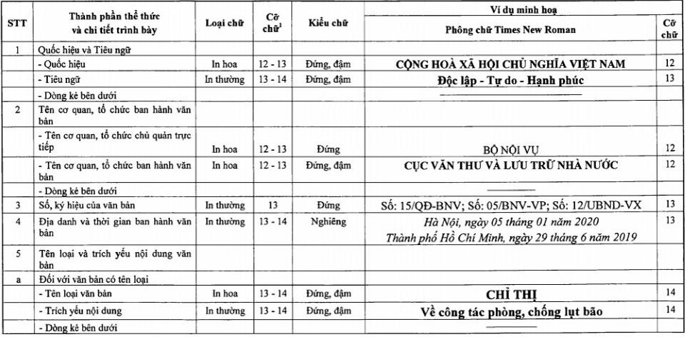 Quốc hiệu “CỘNG HÒA XÃ HỘI CHỦ NGHĨA VIỆT NAM”: Được trình bày bằng chữ in hoa, cỡ chữ từ 12 đến 13, kiểu chữ đứng, đậm và ở phía trên cùng, bên phải trang đầu tiên của văn bản.