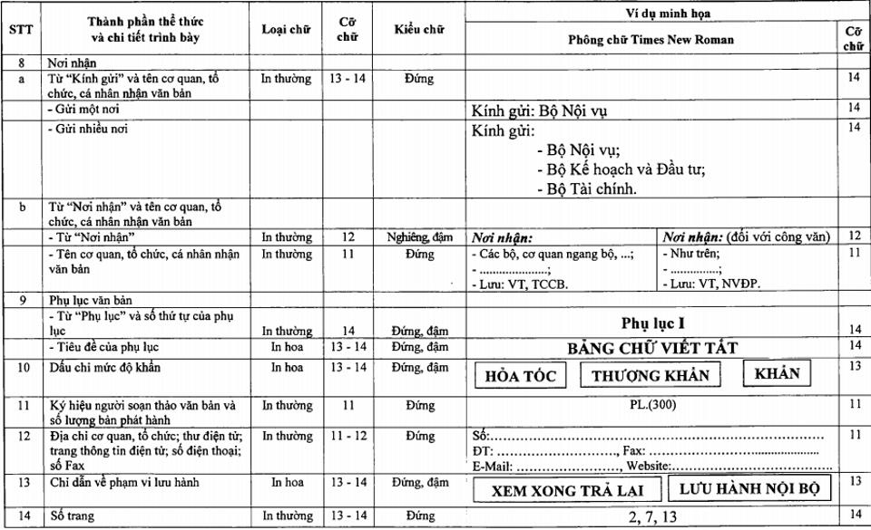 Từ “Nơi nhận” được trình bày trên một dòng riêng (ngang hàng với dòng chữ “quyền hạn, chức vụ của người ký” và sát lề trái), sau có dấu hai chấm (: ), bằng chữ in thường, cỡ chữ 12, kiểu chữ nghiêng, đậm;